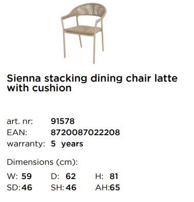 Chaise à la forme ronde. Prenez place et profitez du soleil à Sienna. Structure en aluminium et corde couleur latté, ces chaises sont empilables et les coussins sont résistants aux intempéries.