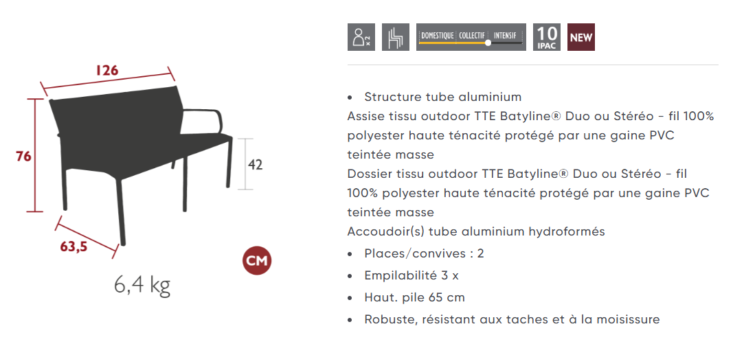 Son design moderne et harmonieux, aux lignes fluides et aux courbes raffinées, s’intègre facilement dans tous les environnements : terrasse, jardin ou balcon. Idéale pour créer un coin détente accueillant, la banquette Cadiz séduit aussi par ses accoudoirs hydroformés, issus d’une technologie innovante inspirée de l’aéronautique. Ce procédé de fabrication unique façonne un tube d’aluminium en un accoudoir délicatement galbé, en 17 étapes de précision, pour un résultat à la fois élégant et ergonomique.