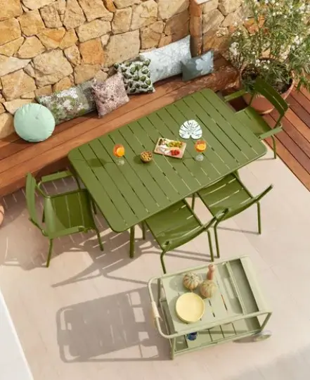 Entièrement réalisée en aluminium, cette desserte roulante résiste aux conditions extérieures, même les plus rudes, et se déplace facilement. Elle trouve évidemment particulièrement bien sa place lorsqu'elle accompagne un ensemble table et chaises Luxembourg : astucieux rappels déclinables en une multitude de couleurs.