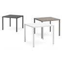 Table empilable 80x80 cm avec plateau DurelTOP en polypropylène traité anti-UV et coloré dans la masse, pieds en aluminium vernis avec vérins de réglage.