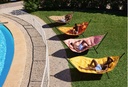 Le hamac et son rembourrage est fait de 100% fibres de polyester et son standard est en métal et caoutchouc.
